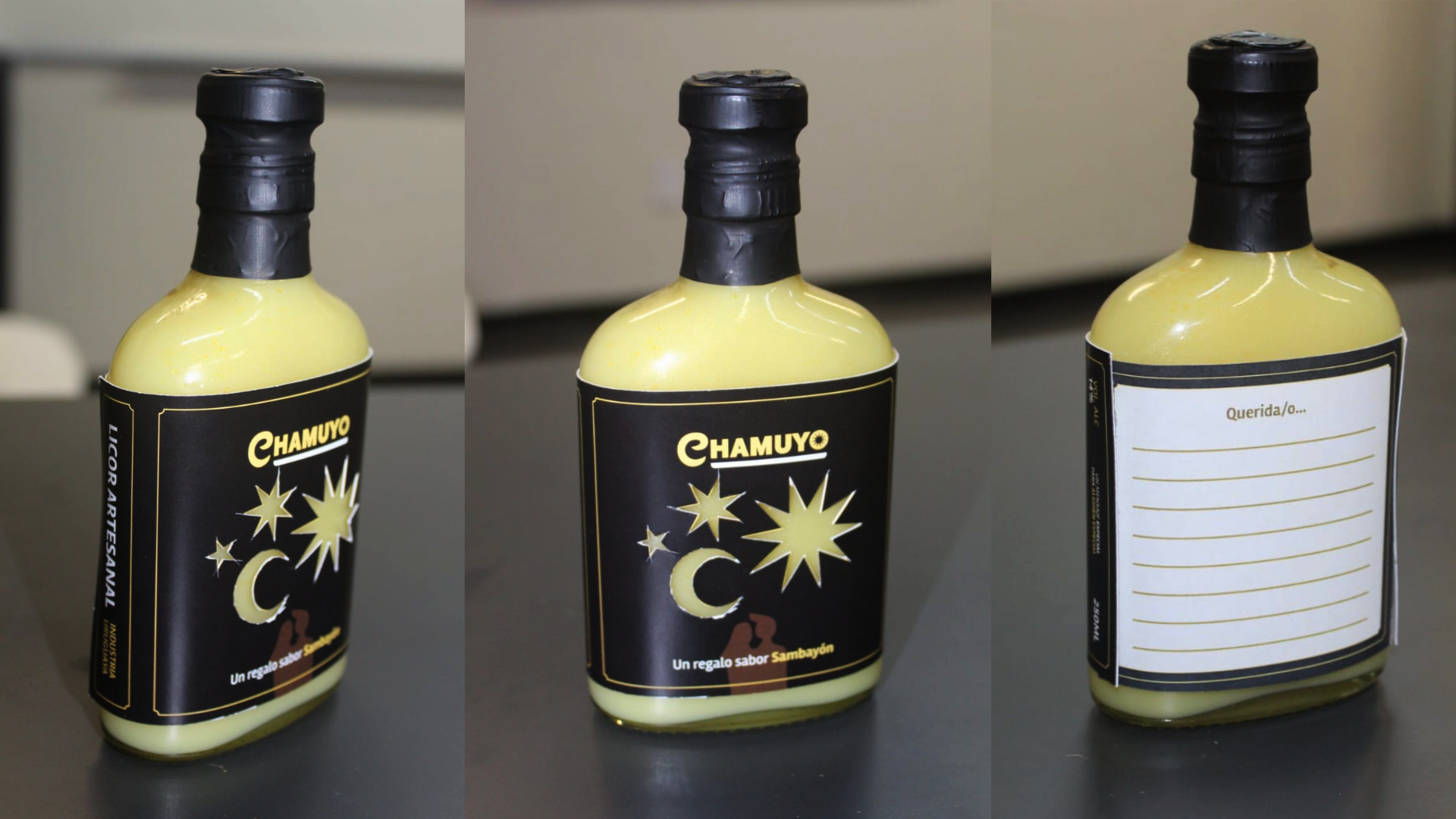 Los elementos de la etiqueta fueron diseñados para interactuar con el color amarillo natural del licor, utilizando recortes con forma de estrellas que dejan ver el producto en su interior. En la parte trasera, una pequeña carta adjunta funciona como recuerdo, y a la vez como una nota de amor para la persona que recibe el licor como regalo.